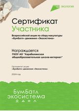 Макулатура успешно вывезена со школы и передана в общую копилку макулатуры Астраханской области. Наша школа получила сертификат участника Всероссийской акции по сбору макулатуры «БумБатл» движения «Экосистема».