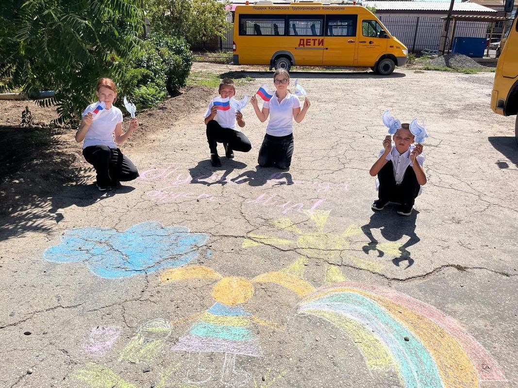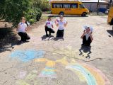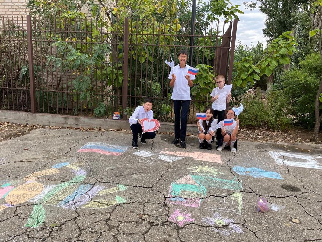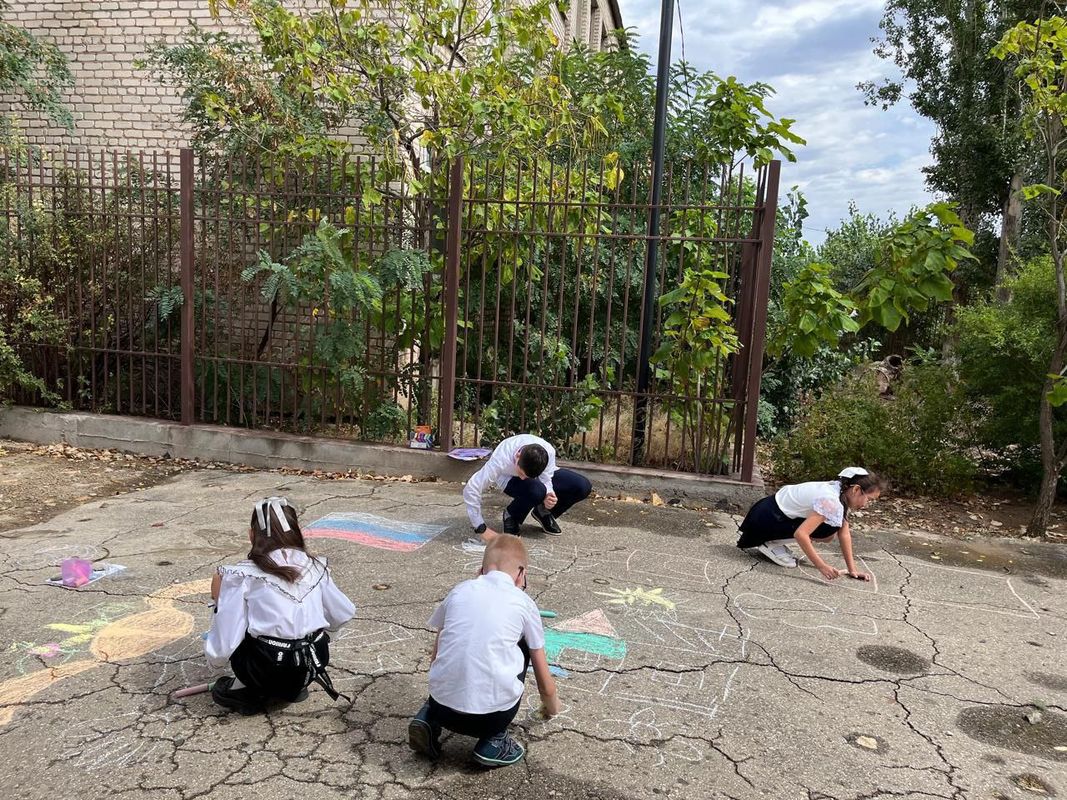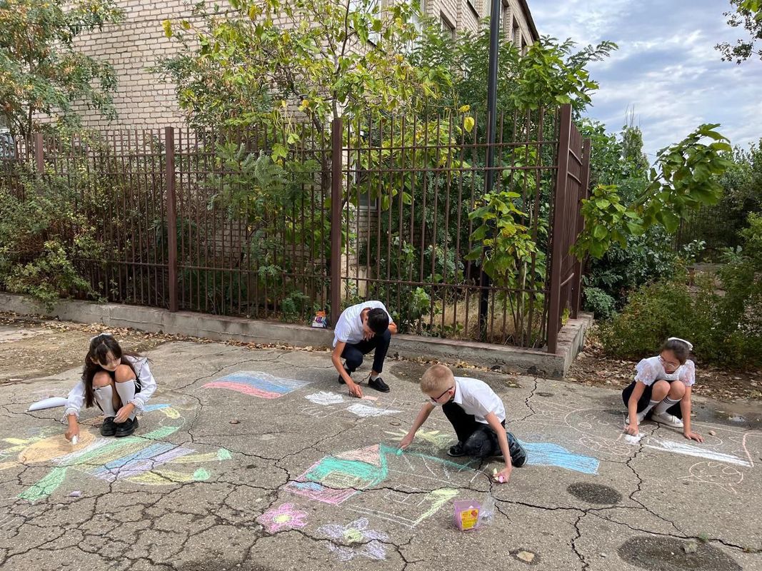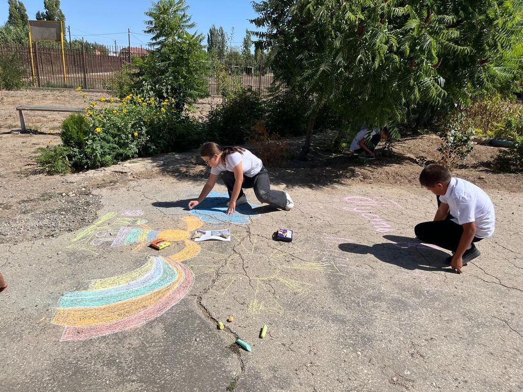 Дети с энтузиазмом взялись за разноцветные мелки, и вот на серой поверхности появились яркие следы. Еще недавно скучный темно-серый асфальт заиграл всеми цветами радуги: на нём появились цветы, голубь, солнце, дети, дом, радуга, российский флаг. Обучающиеся школы создали целую выставку рисунков на асфальте. Детский рисунок - это символ того, что дети тоже переживают эту трагедию. В своих работах ребята изобразили мир на планете, переливающийся цветами радуги. Дружеская атмосфера и теплая солнечная погода способствовали активному творчеству ребят и созданию ярких рисунков. Все работы отразили богатый духовный мир детей, их любовь к Родине, стремление к миру и дружбе.