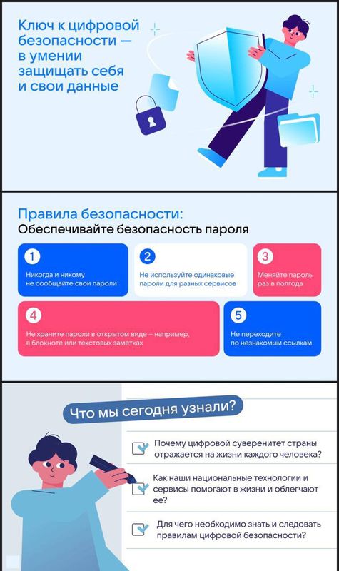В видеороликах обучающиеся познакомились с отечественными продуктами и сервисами, которые помогают поддержать независимость государства в цифровом пространстве. В видеоролике ведущие эксперты IT-сферы на простых примерах объяснили, как обеспечивается цифровая безопасность страны. В интерактивных заданиях ребята смогли сами сопоставить ключевые элементы цифрового суверенитета: отечественные поисковики, мессенджеры, социальные сети и магазины приложений. Ребята узнали о российских платформах, которыми мы все пользуемся: ВКонтакте, RUTUBE, Госуслуги и новом мессенджере MAX.