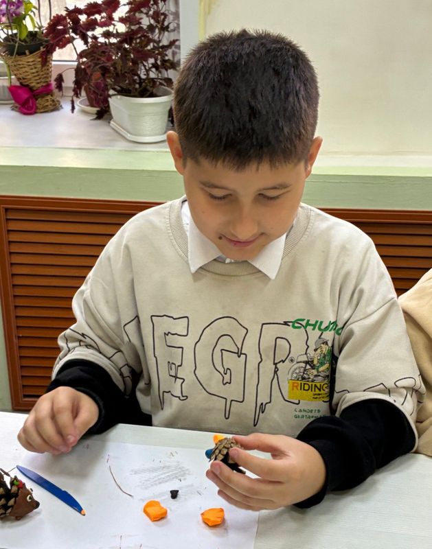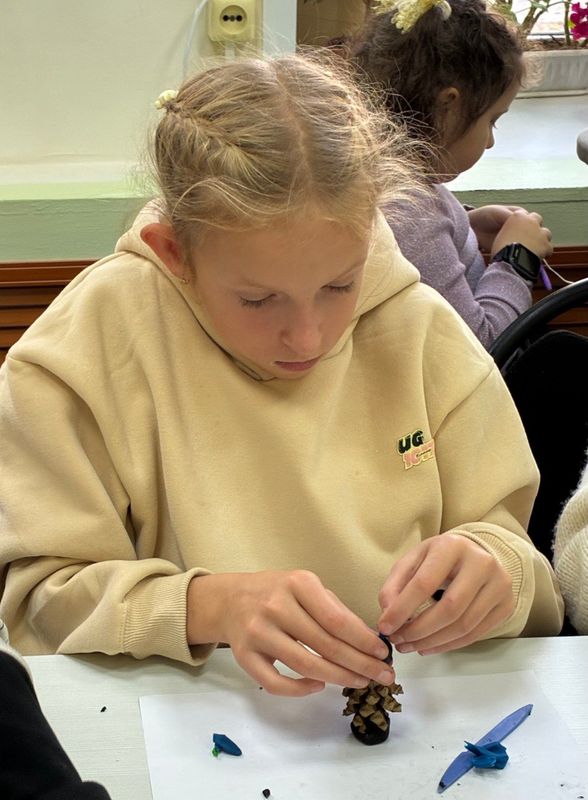 На занятии в творческой студии «Город мастеров» (ЦДТ) дети работали с шишками. Они создавали фигурки животных — как реальных, так и фантастических. Под чутким руководством педагога Ларисы Евгеньевны ребята совершенствуют навыки работы с природным материалом и пластилином, а также учатся общаться с учащимися из других школ.
