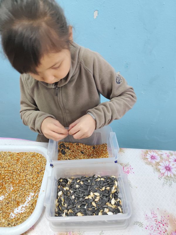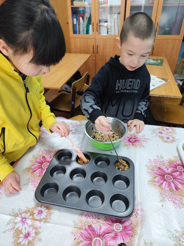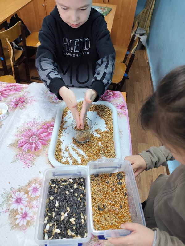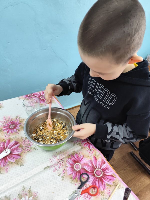 Ребята с неподдельным энтузиазмом принялись за самое главное – приготовления "теста" для будущих кормушек дело. На столе появились разнообразные семена и зерна: просо, овес, семечки подсолнечника, тыквы, пшеница, сухофрукты. Все это богатство было смешано с натуральным связующим – желатином, крахмалом и арахисовой пастой, которые не только скрепляют ингредиенты, но и являются ценным источником энергии для птиц в холодное время года.