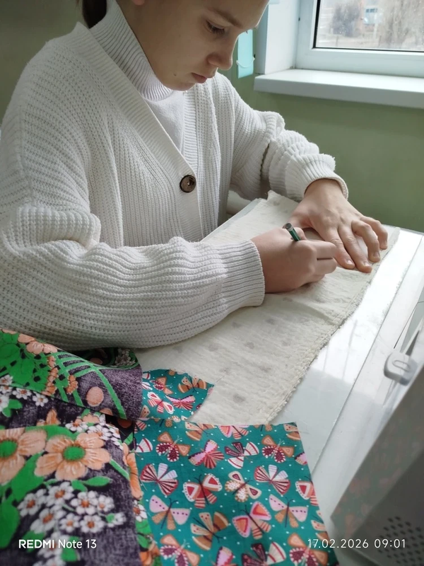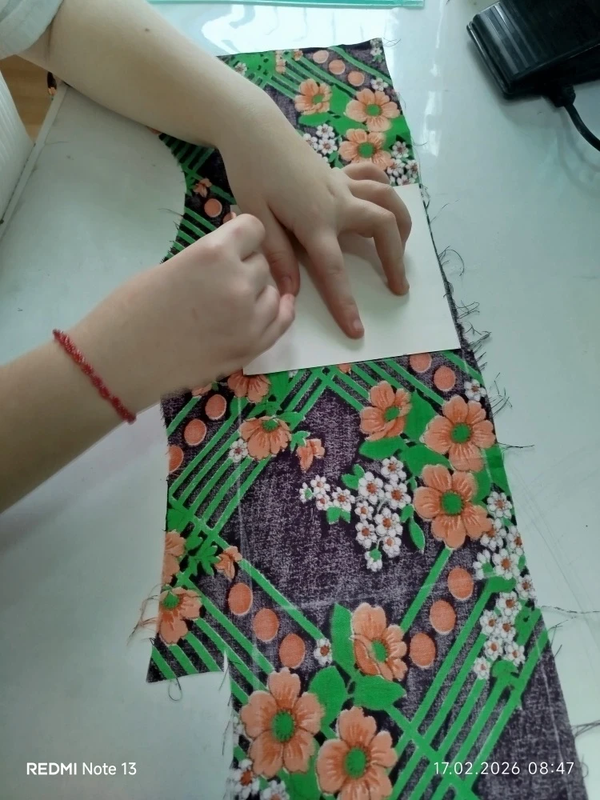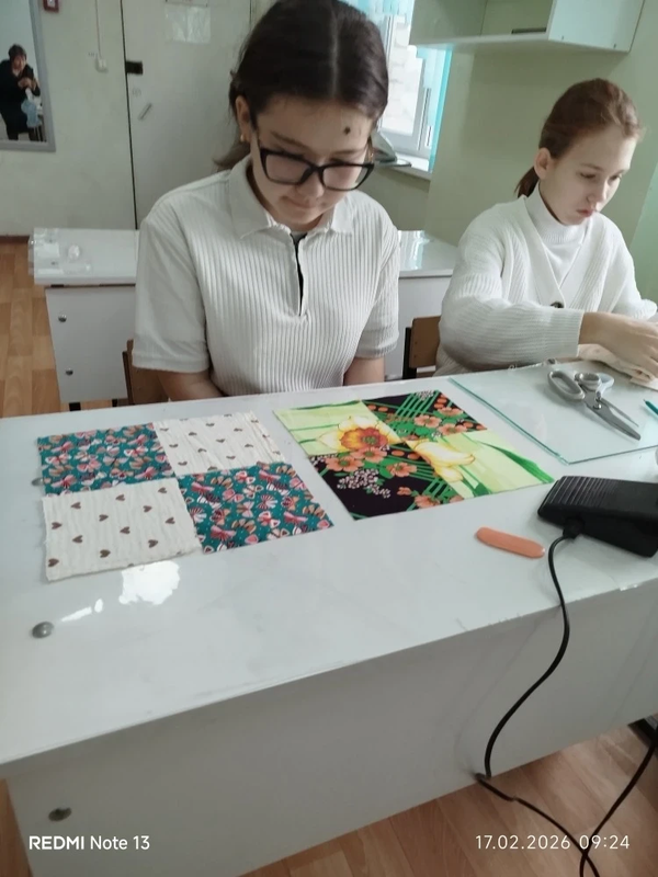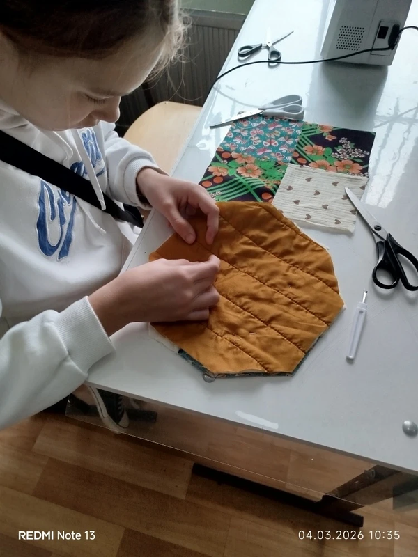 Чтобы изделие получилось ярким и красочным, нужно правильно подобрать цветовое сочетание тканей. Девочки внимательно подбирали кусочки, выбирали лучшие варианты. В этой работе необходимо четко и правильно стачивать детали не допуская неточностей и перекосов.