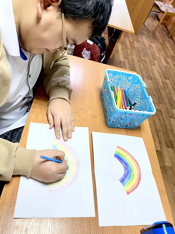 Каждый ребёнок получил задание: нарисовать не просто радугу, а ту, о которой он мечтает. Кто-то изобразил классическую семицветную дугу, кто-то — волшебный мост между облаками, а кто-то превратил радугу в разноцветную дорогу к своей заветной мечте.