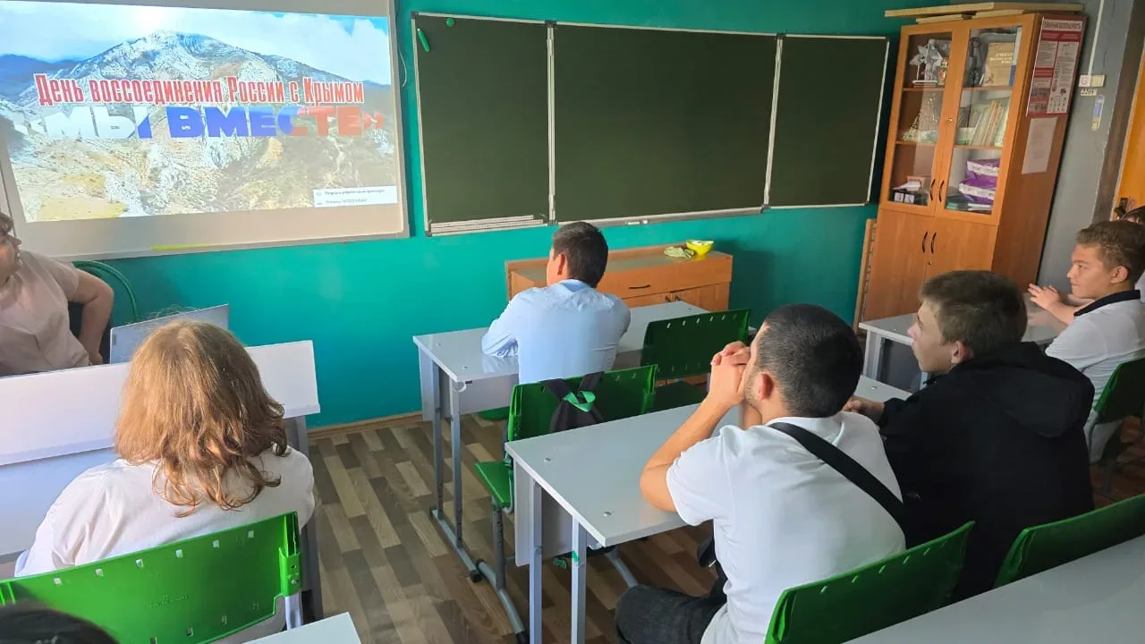 Воспитатель подробно описал историю Крыма, события марта 2014 года, его достопримечательности и природную красоту. Ребята узнали о символике Крыма, изучили его флаг, герб и гимн. Также ученикам показали фотографии Крымского моста. В конце занятия все посмотрели художественный фильм "Навсегда".