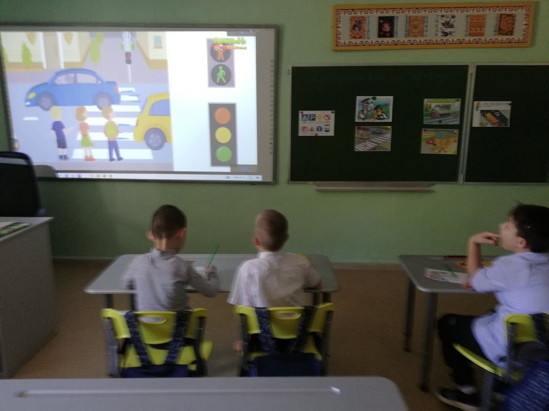 Посмотрев мультфильм "Азбука безопасности", первоклассники вместе с педагогом повторили правила дорожного движения.